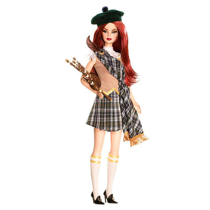 La bambola Barbie scozzese ha un aspetto straordinariamente dolce in una graziosa gonna a pieghe scozzese, fascia abbinata, gilet marrone chiaro e top bianco di pizzo. Calzini bianchi al ginocchio, Mary Jane nere e un berretto verde completano il look. Nella vera tradizione scozzese, una serie di cornamuse accompagnano la bambola.