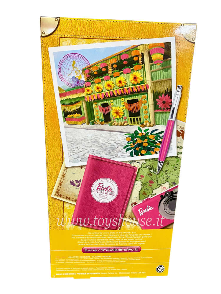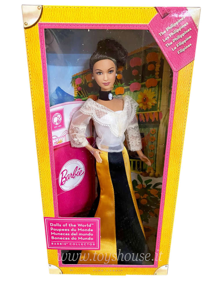Kamusta ka! Welcome to the Philippines! To celebrate the annual colorful Pahiyas Festival, Barbie® Philippines doll wears a traditional Maria Clara dress with alternating gold and black panels and beautiful lace details. Includes passport and country stickers.