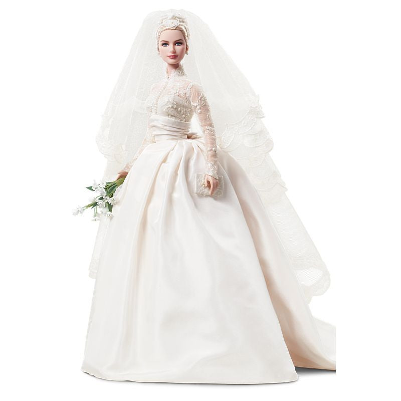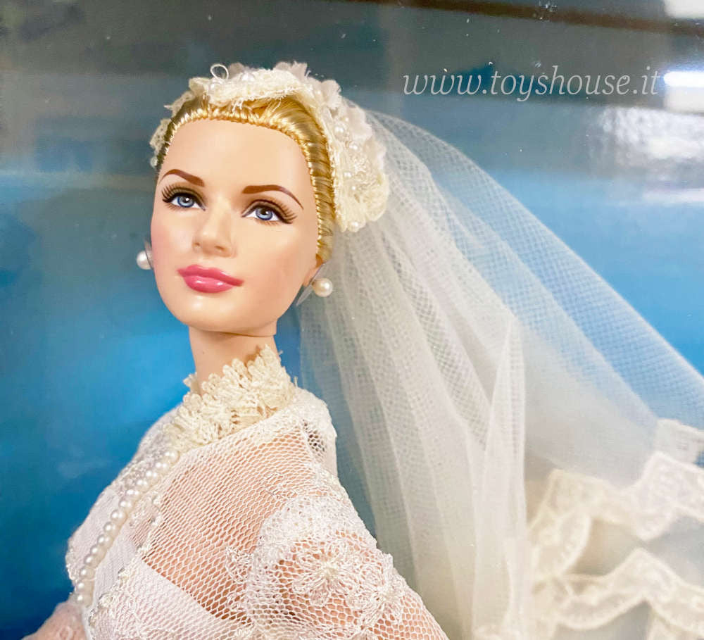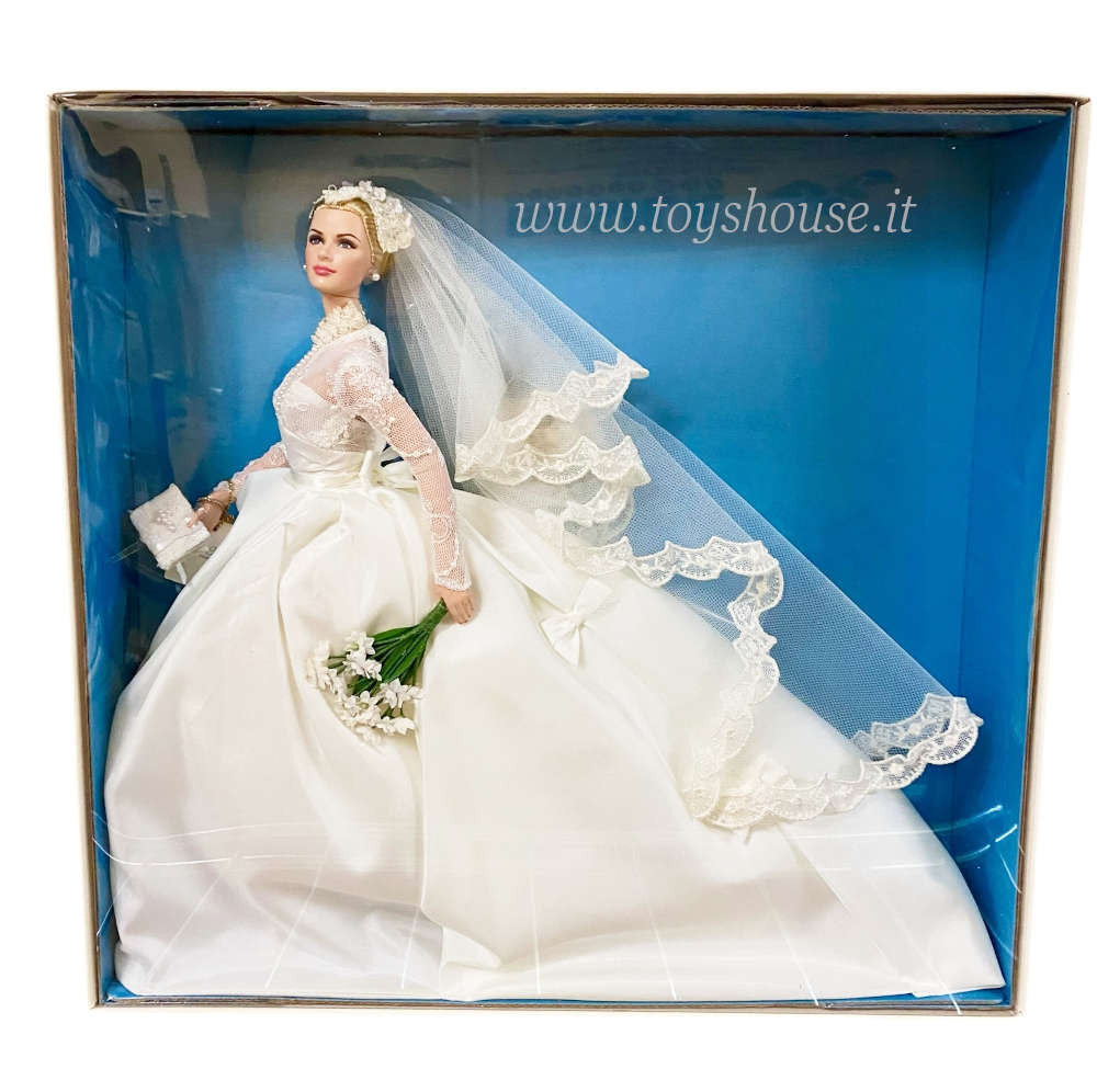 Scolpita a somiglianza di Grace Kelly e con un corpo Silkstone®, questa bambola segna la prima volta, al di fuori della Barbie® Fashion Model Collection, che Silkstone® è stato utilizzato per una bambola. L'attrice americana Grace Kelly ha sposato il principe Ranieri di Monaco in uno splendido abito che è stato fedelmente ricreato per catturare ogni minimo dettaglio. L'abito presenta un busto aderente con una dolce fila di bottoni perlati sul davanti, mentre il lungo strascico incorpora un delizioso inserto di pizzo. Il lungo velo di tulle è bordato di pizzo, e questa bellissima sposa porta un piccolo libro di preghiere d'avorio in una mano e un "bouquet" di mughetto nell'altra. Il trucco per il viso è adeguatamente attenuata per l'occasione, con semplici orecchini di perle che aggiungono un tocco finale sofisticato. Prodotti 13100 pezzi.
