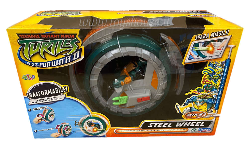 Teenage Mutant Ninja Turtles Fast Forward Steel Wheel & Michelangelo veicolo trasformabile contiene Michelangelo con la sua Steels Wheel e diversi accessori. Gira la leva, la ruota si aprirà e si potrà sparare missili e spingerla in avanti! Contiene piccole parti, non adatto ai bambini di età inferiore ai 3 anni.